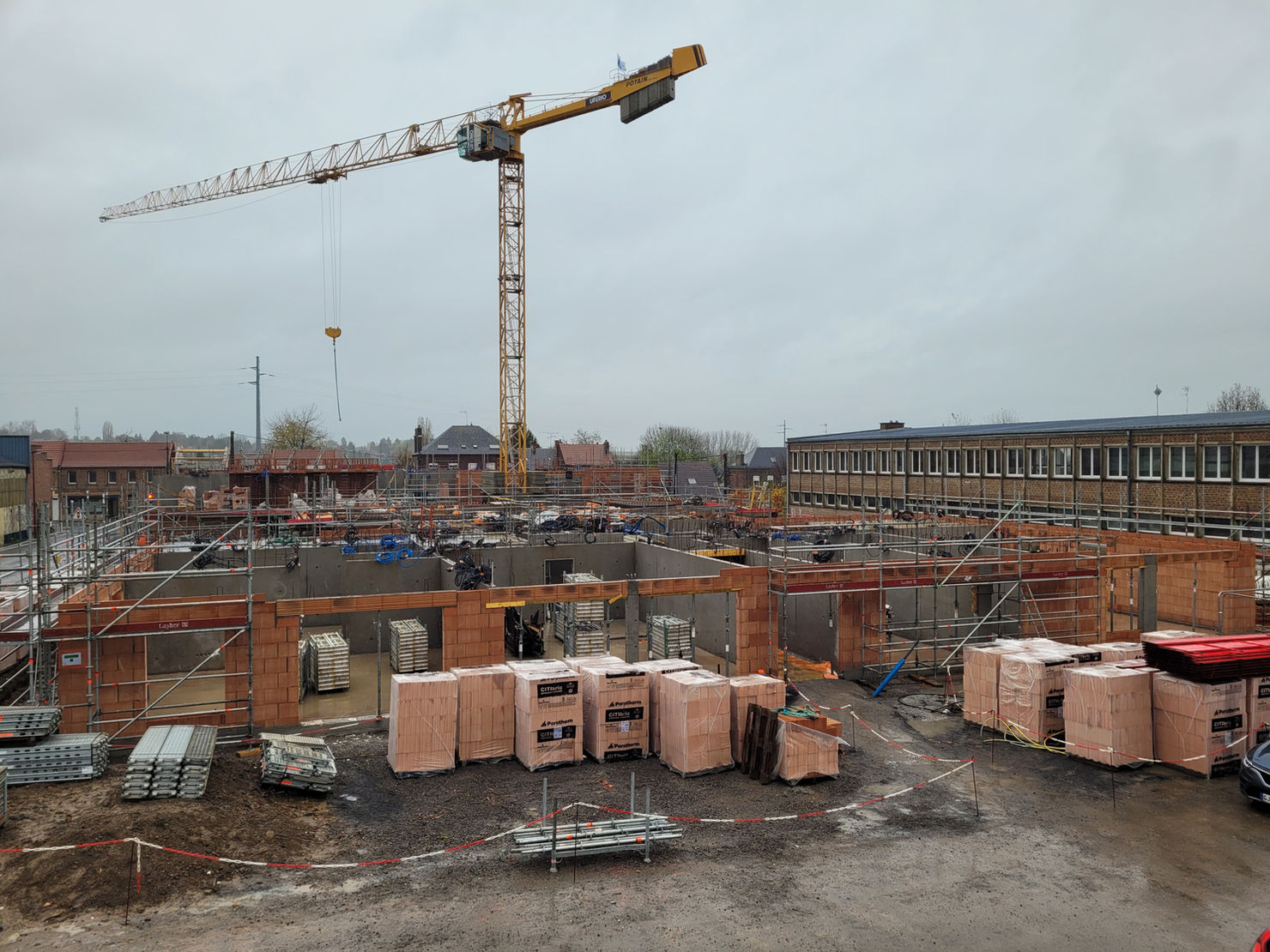 La structure du bâtiment collectif a été montée étage par étage. MHC Construction a opté pour des murs en briques porteuses, répondant aux normes thermiques et esthétiques locales. Les niveaux se sont élevés successivement, avec le coulage de dalles en béton entre chaque étage afin d’assurer la rigidité de l’ensemble. L’utilisation d’engins de levage sur site a facilité l’approvisionnement des matériaux en hauteur et accéléré le rythme du chantier.